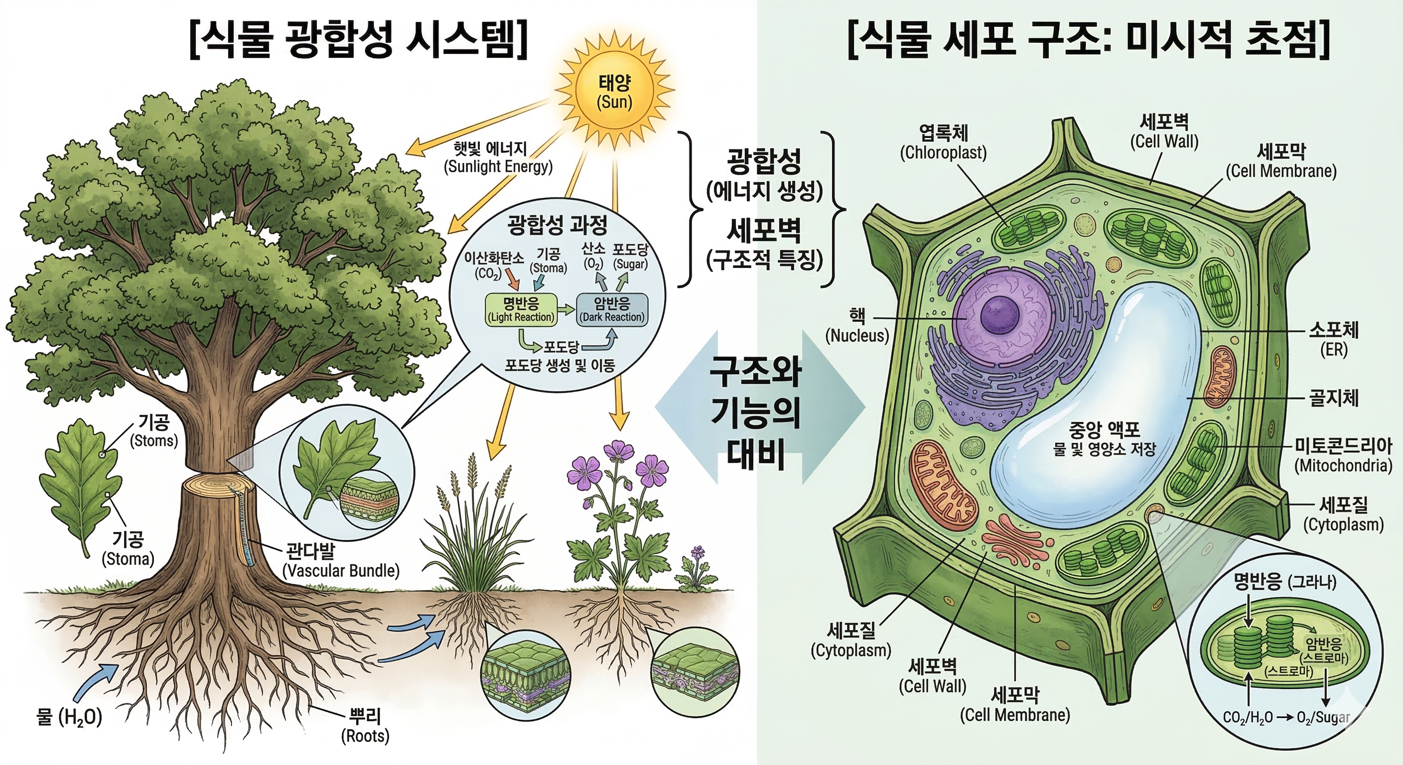 - 단단한 성벽, 세포벽: 식물은 동물과 달리 세포 주변에 단단한 '세포벽'이 있어서 뼈가 없어도 곧게 서 있을 수 있답니다.